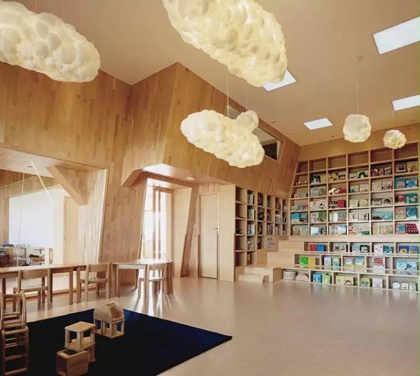 幼儿园位于深圳一个靠海边的住宅区内,周边绿树环抱且采光充足,为了形成楼体与周边植物环境的和谐关系,同时给孩子提供更亲近大自然的成长环境。在幼儿园设计中设计师以木材作为主要材料,白色作搭配,用最简洁的方式营造温馨的儿童学习环境,建筑师儿童空间与成人空间作结合,抛弃了传统上对于儿童空间惯用的弧线,理性的以几何线条作为空间语言,给儿童带来更强的空间认知感,另外为了锻炼儿童身体平衡的感知力,特地选择了在保证儿童安全的同时,又能够训练小孩平衡力的柔软度的塑胶地板,幼儿园内还有部分小斜坡设计,让孩子在活动时身体感知得到全面的发展。