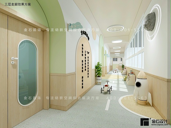 幼儿园走廊空间视觉上通常相对狭长,如果是单一的墙裙,那么在视觉上会更加的单调和狭长。因此在幼儿园墙裙设计时,可以使用不同颜色或者不同材料的墙裙进行分割,例如不同颜色或花纹的墙砖,或者实木扣板、钢化玻璃、铝塑板材料等。这样既可用不同的材料提示出不同的空间,又能在缩短视觉进深的同时给幼儿园提供环创所需要的基础。